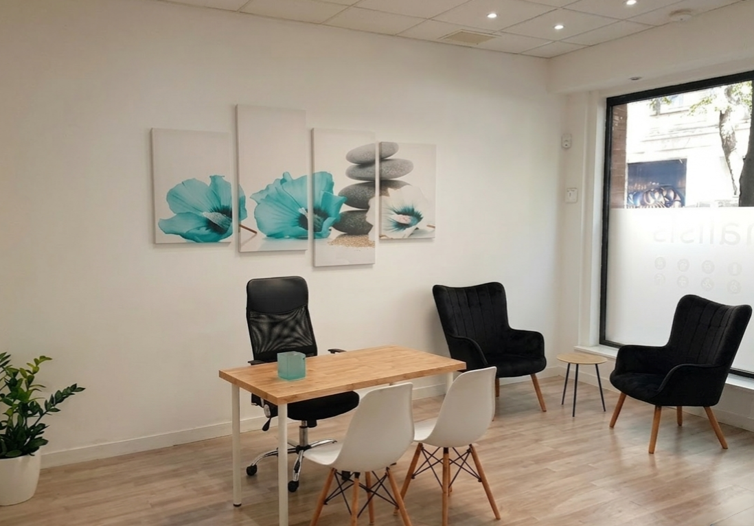 Nuestros despachos son completamente funcionales y disponen de una zona de escritorio y una zona de sillones individuales, para que puedas adaptar el espacio a las sesiones con cada uno de tus pacientes.